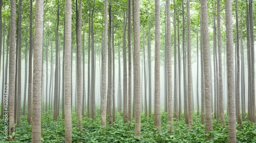 © Khritthithat, Naklejka premium Serene Foggy Forest with Tall Trees Surrounded by Lush Green Foliage Creating a Tranquil and Calm Natural Environment for Relaxation and Reflection