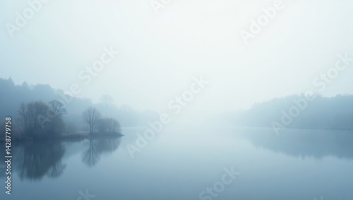 Fototapeta premium Serene Foggy Lake Landscape Misty Morning Trees Reflected Tranquil Waterscape