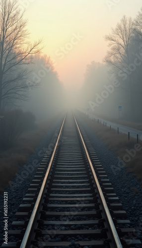 © MIJARI, Fototapeta premium Serene Foggy Morning on a Quiet Railroad Track Surrounded by Trees