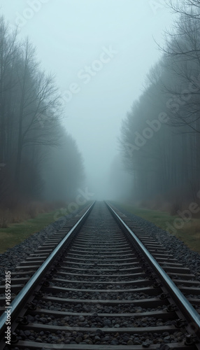 © MIJARI, Fototapeta premium Serene Foggy Railroad Tracks Surrounded by Trees in a Quiet Forest Setting