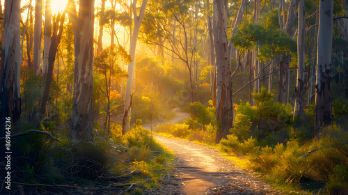 Fototapeta premium Serene footpath winding through a dense eucalyptus forest, with golden sunset...