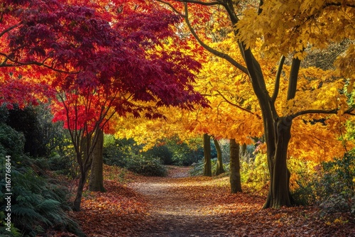 Naklejka premium Serene Footpath Winding Through Lush Trees at Westonbirt Arboretum - A...