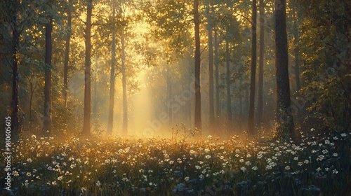 © Hailie, Obraz premium Serene Forest at Sunrise with Mist and Wildflowers