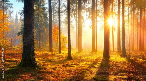 © Wan, Fototapeta premium Serene forest at sunrise with vibrant autumn colors.