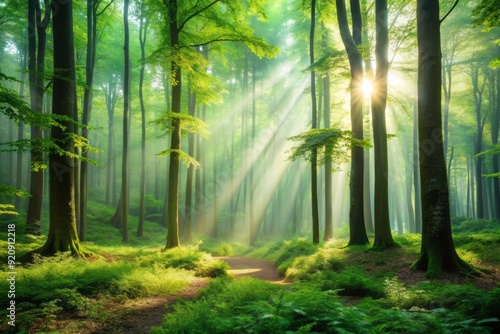 Naklejka premium Serene forest atmosphere with dappled sunlight filtering through lush green...