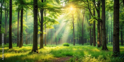 © Watcharapon, Obraz premium Serene forest atmosphere with soft focus on natural elements, trees, foliage, trees, foliage, stillness, peaceful