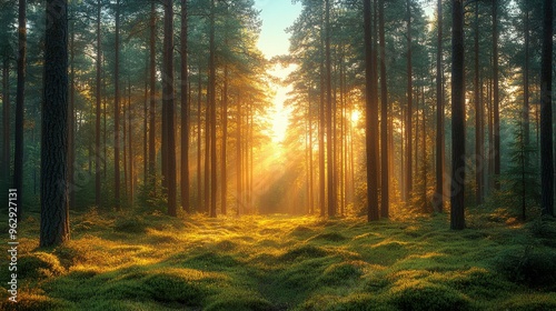© Surachate, Obraz premium Serene Forest Clearing, a tranquil space surrounded by tall trees, illuminated by warm golden sunlight, inviting peace and reflection.
