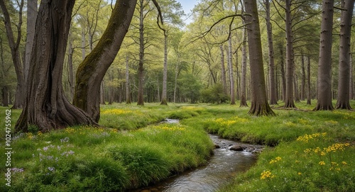 © Arceli, Naklejka premium Serene forest clearing with a small stream flowing through ancient trees and wildflowers blooming