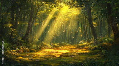 © Monchisa, Naklejka premium Serene Forest Clearing with Golden Light Streaming Through Trees