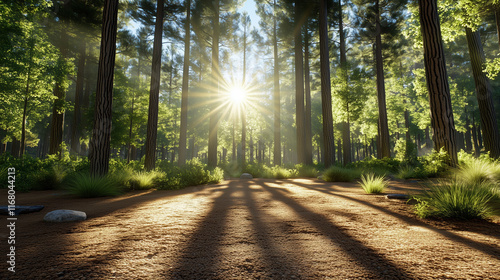 Fototapeta premium serene forest clearing with sunlight filtering through trees, creating shadows