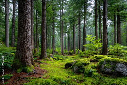 Naklejka premium Serene forest floor covered with moss, tall trees reaching towards the sky above