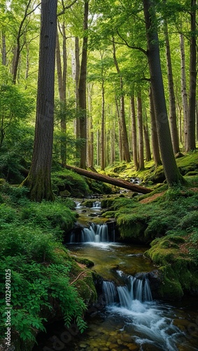 © Earl, Obraz premium Serene forest glade with a clear flowing stream background for invitation or card screensaver