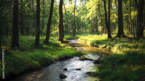 Obraz premium Serene forest glade with towering trees and a babbling brook, stream,...