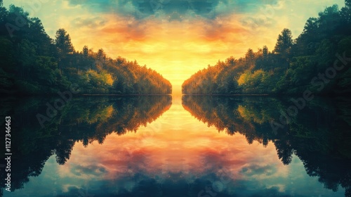 Obraz premium Serene forest lake at sunset with glowing clouds and symmetrical reflections...