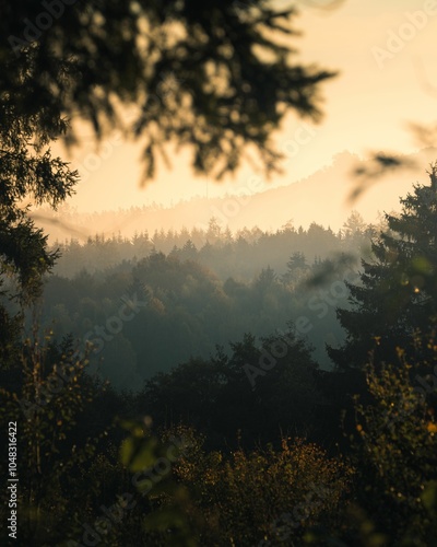 Fototapeta premium Serene forest landscape at dawn with misty hills and silhouetted trees in a...
