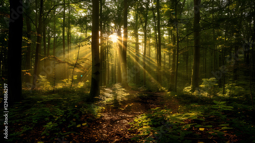 Fototapeta premium Serene Forest Landscape Bathed in Early Morning Sunbeams Casting a Golden Glow