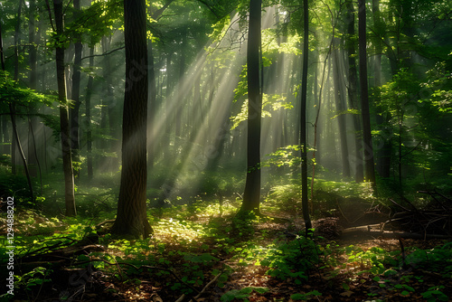 Fototapeta premium Serene Forest Landscape Bathed in Early Morning Sunbeams Casting a Golden Glow