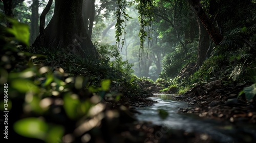Naklejka premium Serene forest landscape with a flowing stream, dappled sunlight, and lush...