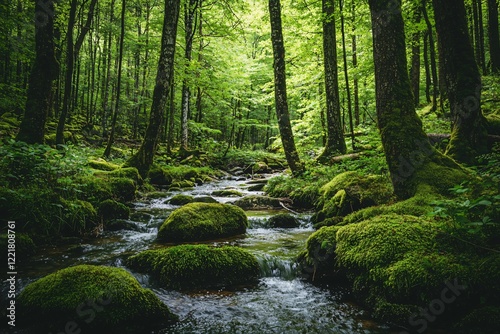 © Adi, Obraz premium Serene forest landscape with a flowing stream, lush greenery, and moss-covered rocks in a tranquil setting