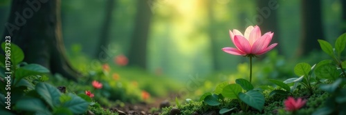 Fototapeta premium serene forest landscape with a single blooming flower, flowers, outdoors,...
