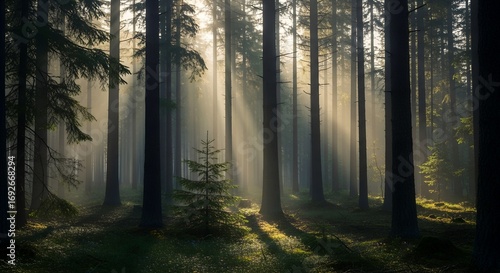 © MAMRAN, Fototapeta premium Serene forest landscape with beautiful sun rays filtering through trees.