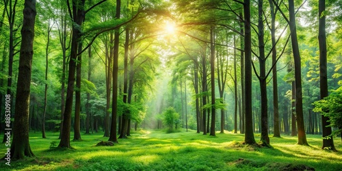 Naklejka premium Serene forest landscape with lush greenery and tall trees, Forest, trees, greenery, nature, landscape, serene