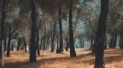 © Chom, Fototapeta premium Serene forest landscape with olive trees and golden grass under a clear blue sky, a peaceful and tranquil natural setting