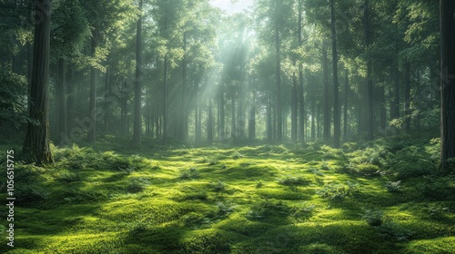 Obraz premium Serene forest landscape with sunlight filtering through trees.
