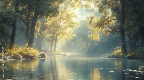 Obraz premium Serene forest landscape with sunlight filtering through trees.