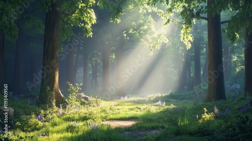 © Pichapob, Obraz premium Serene Forest Landscape with Sunlight Filtering Through Trees
