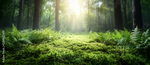 Obraz premium Serene forest landscape with sunlight filtering through trees, highlighting...