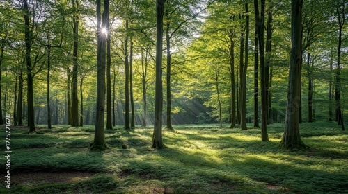 © Monchisa, Obraz premium Serene Forest Landscape with Sunlight Streaming Through Trees