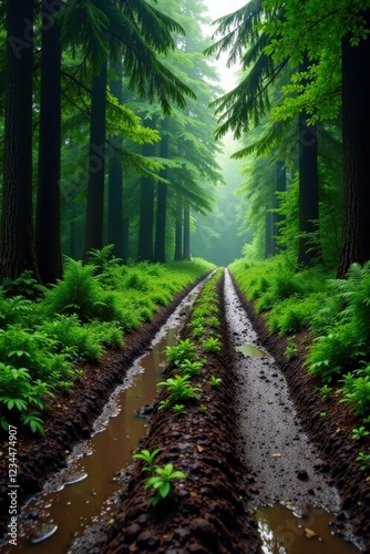 Fototapeta premium Serene Forest Path A Misty Green Canopy, Twin Ruts Reflecting Tranquil...