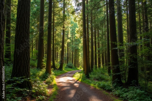 © Dan, Obraz premium Serene Forest Path Bathed in Dappled Sunlight