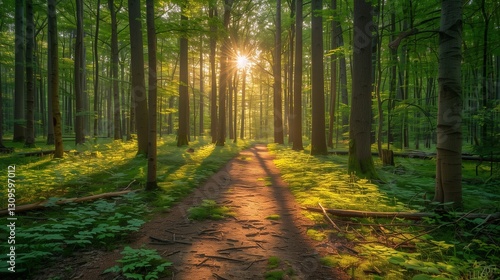Fototapeta premium Serene forest path bathed in golden sunlight filtering through tall trees with lush greenery creating a peaceful natural scene