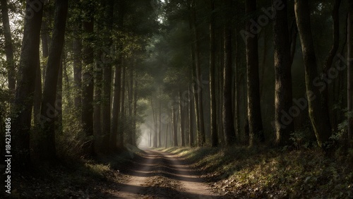 Fototapeta premium Serene forest path bathed in morning light, misty trees create tranquil atmosphere. Perfect for nature lovers and peaceful escapes.