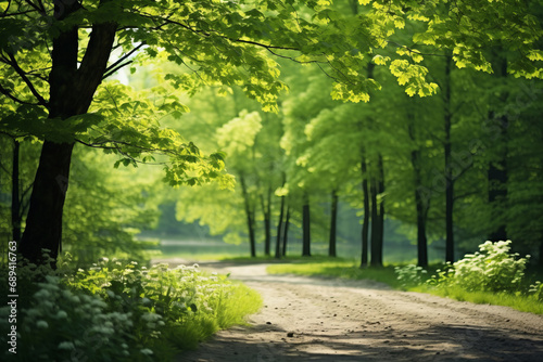 Naklejka premium serene forest path dappled with sunlight, where the lush green leaves glow against the soft shadows, creating a peaceful and inviting atmosphere.