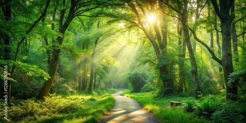© Collection, Obraz premium Serene Forest Path Illuminated by Golden Sunbeams, a Tranquil Woodland Scene with a Rustic Bench