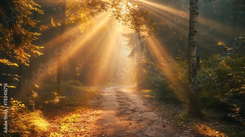 © Bijac, Obraz premium serene forest path illuminated by golden sunbeams enchanting nature landscape in warm inviting colors