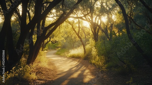 Naklejka premium serene forest path illuminated by golden sunlight