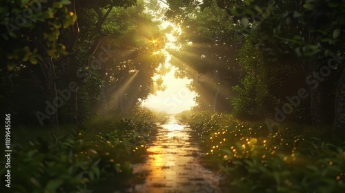© buraratn, Obraz premium serene forest path illuminated by golden sunlight, surrounded by lush greenery and soft foliage. tranquil atmosphere invites exploration and reflection