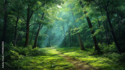 Obraz premium serene forest path illuminated by soft sunlight, inviting exploration and...