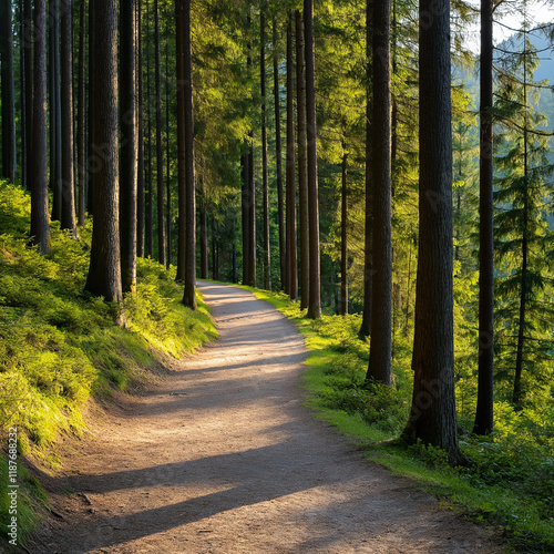 Obraz premium serene forest path illuminated by soft sunlight, surrounded by tall trees and lush greenery, invites peaceful walks and nature exploration