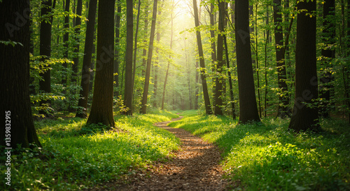 Fototapeta premium Serene forest path illuminated by sunlight in spring