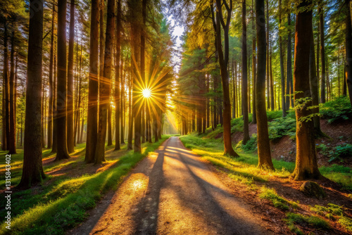 Fototapeta premium serene forest path illuminated by sunlight, surrounded by tall trees and lush...