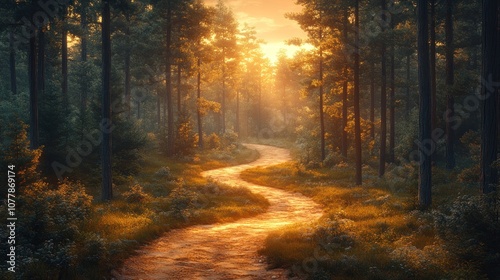 Fototapeta premium Serene forest path illuminated by sunset.