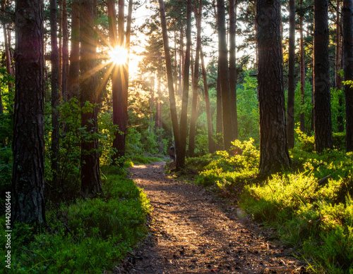 © mingnimit, Fototapeta premium serene forest path illuminated by warm glow of sunrise, surrounded by tall trees and lush greenery, creating peaceful and inviting atmosphere