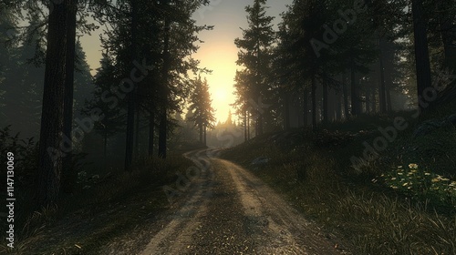 © Maerin Jofan, Obraz premium Serene forest path leading into a glowing sunset.
