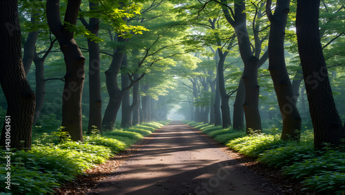 © Rishi, Obraz premium Serene forest path lined with ancient trees