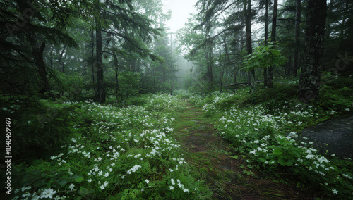 © Rahbah, Fototapeta premium Serene Forest Path Lined With White Wildflowers Creating A Tranquil Scene